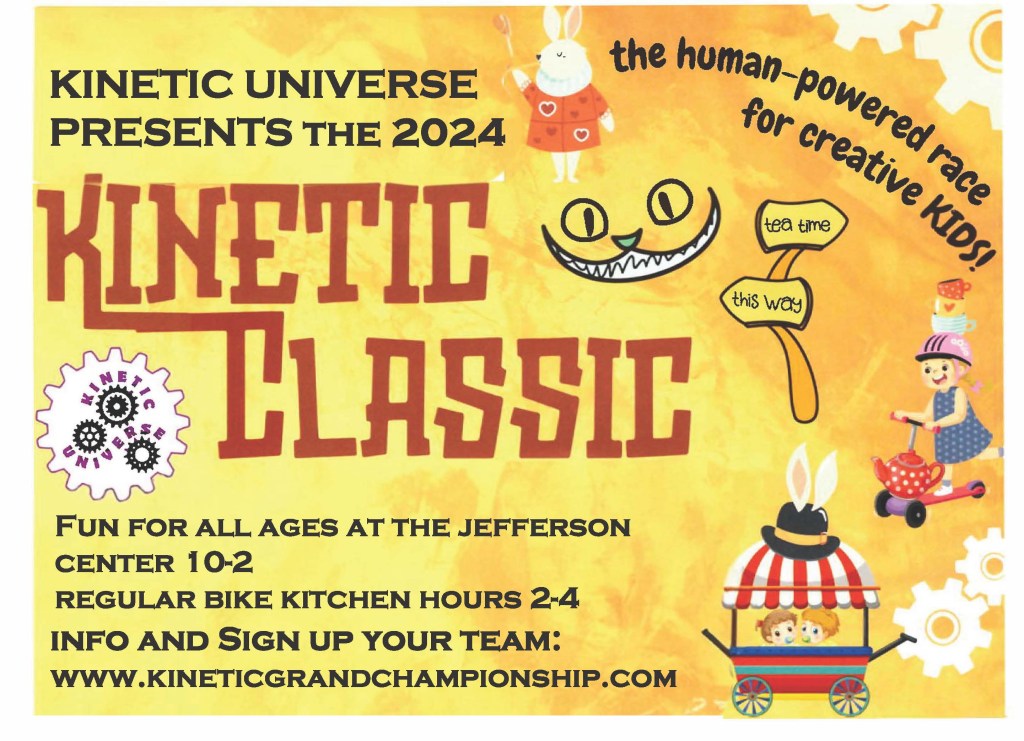 Sunday, September 15th, the Jefferson Community Center hosts the Kinetic Classic. 10am-12pm will show a preview of a new PBS documentary about Leonardo da Vinci and explore his inventive spirit in hands-on activities for all ages. 12-2 there will be a Rutabaga Buggy Bouncer parade for babies, toddlers, and families, a Rutabaga Rally obstacle course for K-3rd grade, and a Kinetic Push Kart Dash for 4th-8th graders. For more information, check out their website at http://www.kineticgrandchampionship.com. The Bike Kitchen’s very own mechanics, Chris and Thom will be on hand with their Kinetic Sculptures and to serve as judges, FOR THE GLORY.
